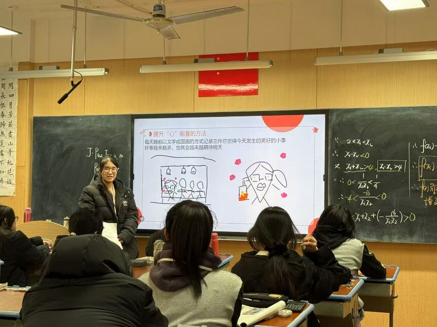 12月18日,班级心理班会课由心理委员主持,主题为“寻找新能量”,在整个班会课中,心理委员首先分析了班级目前的现状,存在的问题,并举行了提升“心”能量的方法小游戏,画出最近开心的事情,同学们积极参与,并解释说明所画内容。