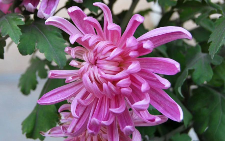 菊花为多年生草本,高 60-150厘米。茎直立,分枝或不分枝,被柔毛。叶互生,有短柄,叶片卵形至披针形,长 5-15公分,羽状浅裂或半裂,基部楔形,下面被白色短柔毛,边缘有粗大锯齿或深裂,基部楔形,有柄。头状花序单生或数个集生于茎枝顶端,直径 2.5-20厘米,大小不一,单个或数个集生於茎枝顶端;因品种不同,差别很大。总苞片多层,外层绿色,条形,边缘膜质,外面被柔毛;舌状花白色、红色、紫色或黄色。花色则有红、黄、白、橙、紫、粉红、暗红等各色,培育的品种极多,头状花序多变化,形色各异,形状因品种而有单瓣、平瓣、匙瓣等多种类型,当中为管状花,常全部特化成各式舌状花;花期 9-11月。